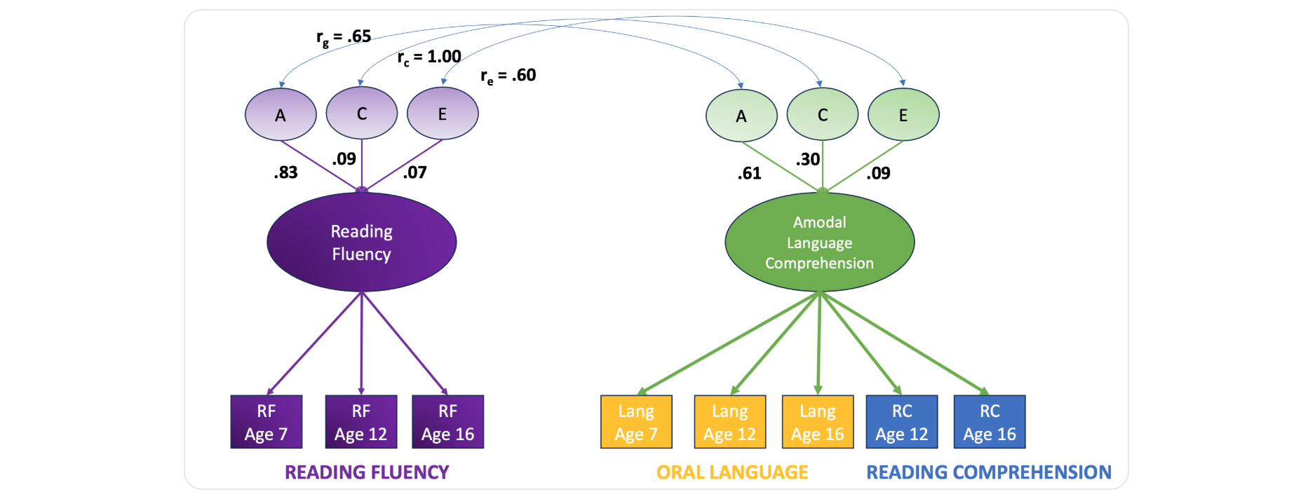 The correlation between genes predicting reading fluency and genes predicting amodal language comprehension — .65, decent, but not 100% — means that they might be some genes special for reading fluency, some for amodal language comprehension, and some for both