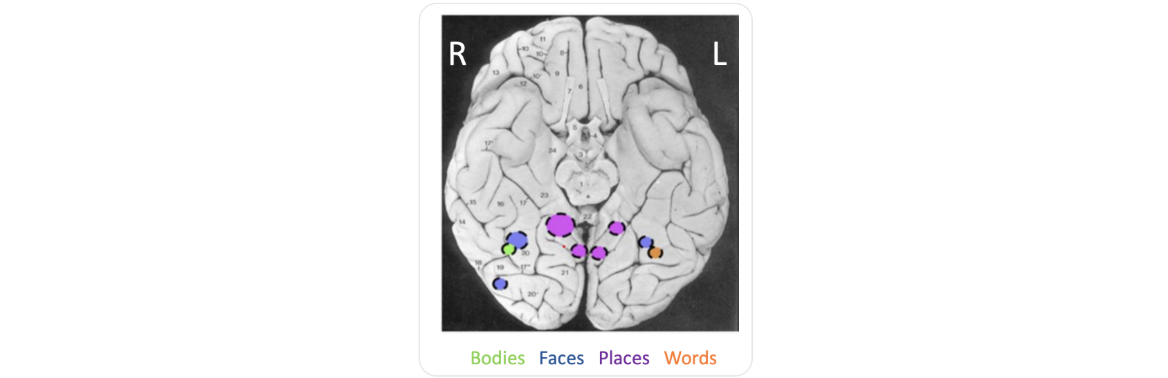 Stimuli: Pictures of words, numbers, tools, houses, faces, and bodies.
