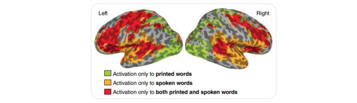 In skilled readers, spoken language and print activate highly overlapping networks. The goal of reading is to access language meaning via the visual modality.