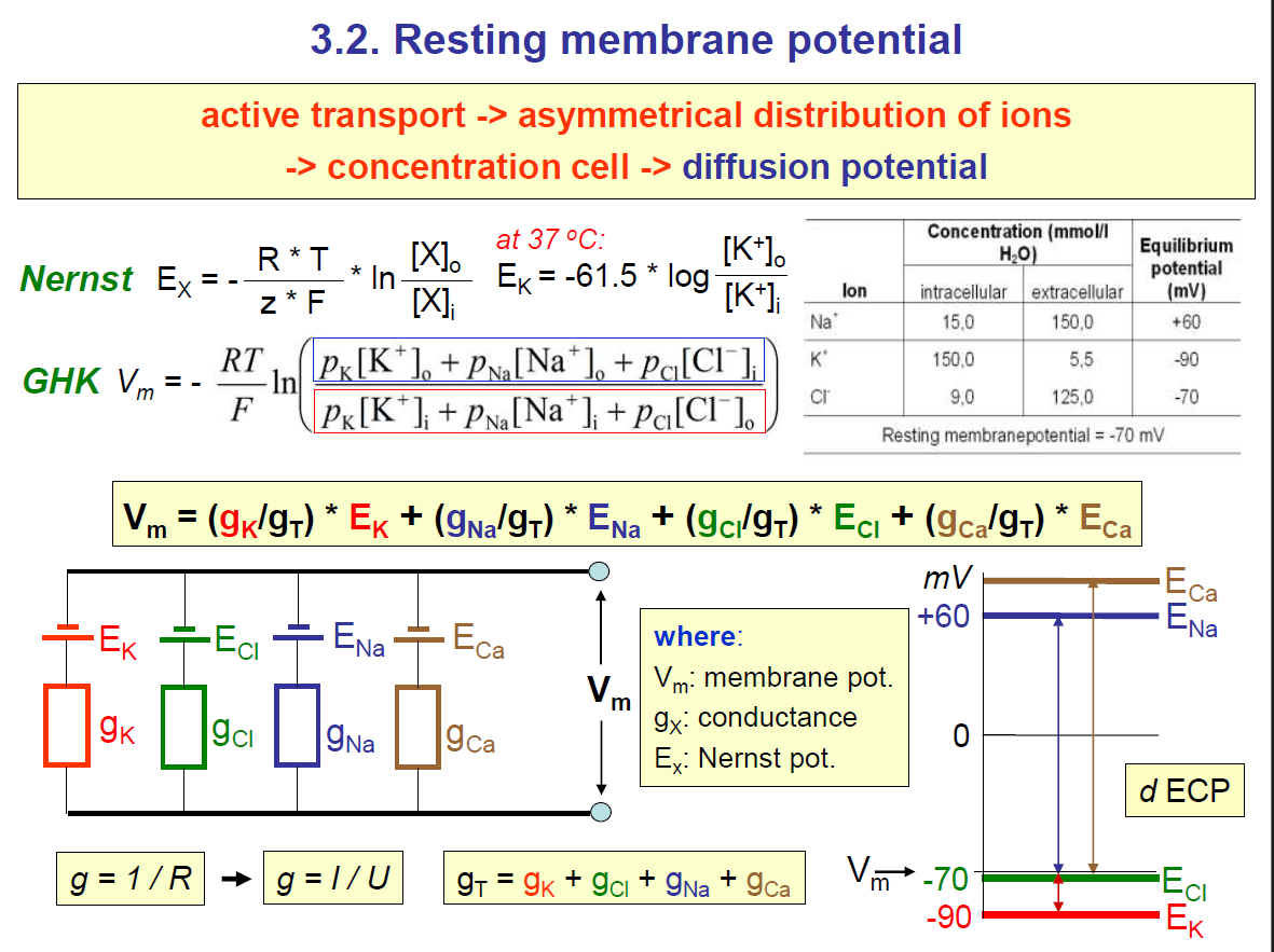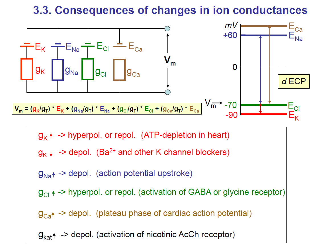 The membrane potential VmV_m is a weighted average of the equilibrium potentials (EK,ENa,ECl,ECa) of different ions.
