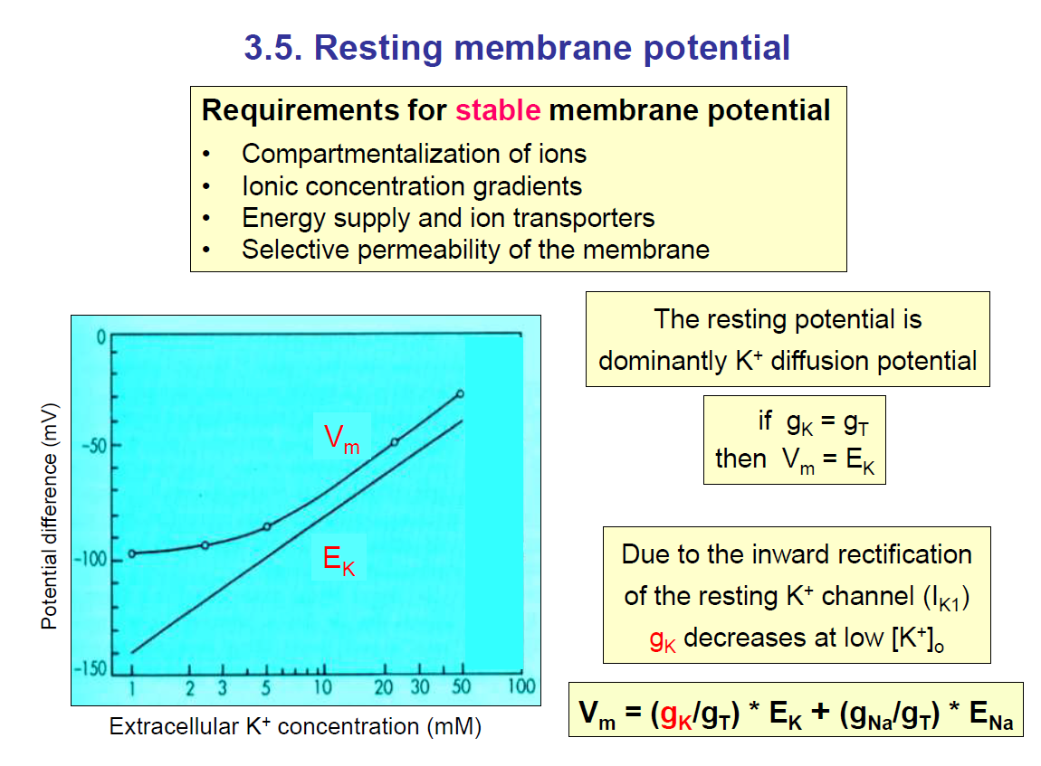 If potassium conductance (gK) dominates, → Vm is close to EK≈−90 mV.