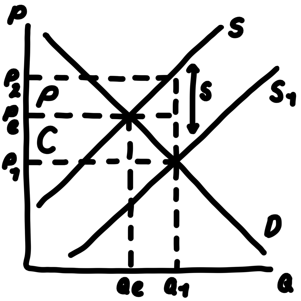 a) purpose of intervention with reference to market failure and using diagrams in various contexts: indirect taxation (ad valorem and specific), subsidies, maximum and minimum prices