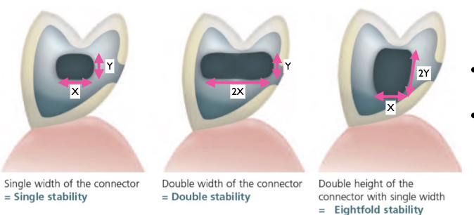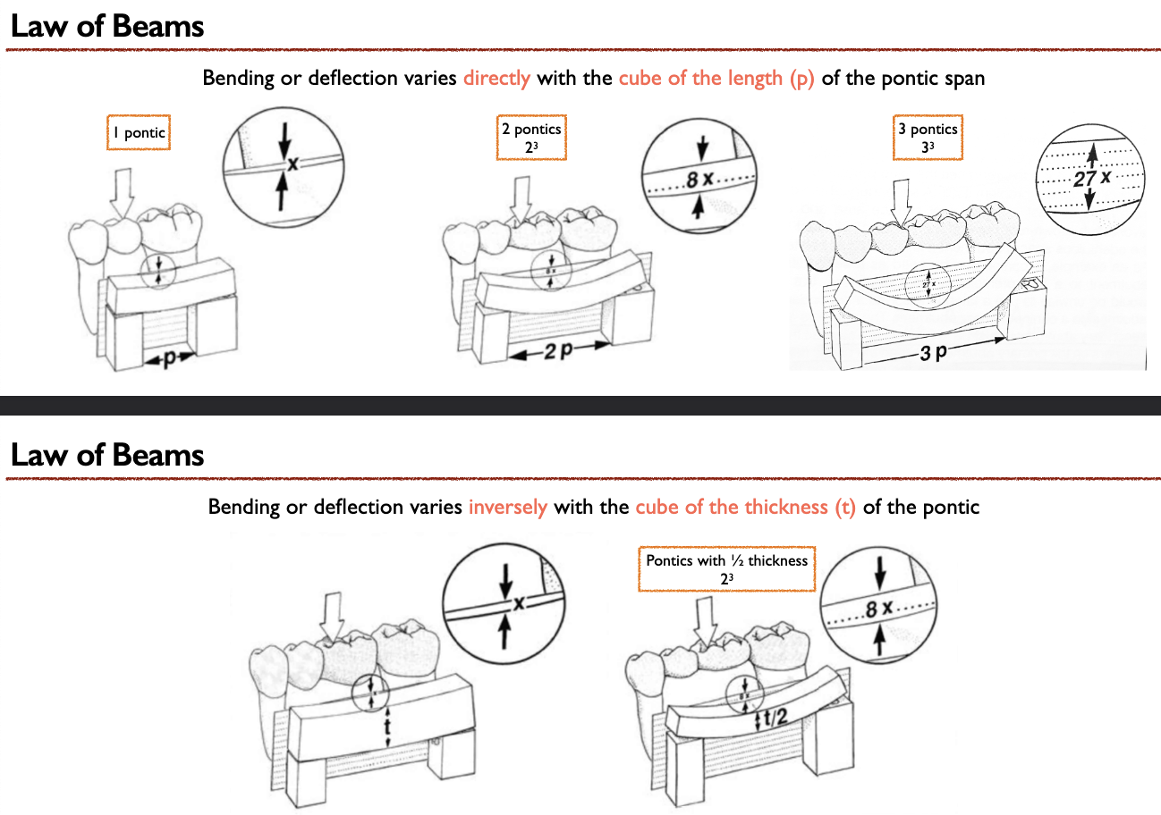 law of beams: bending or deflection varies directly with the cube of the length (p) and inversely with the cube of the occlusoginigval thickness (t) of the pontic span