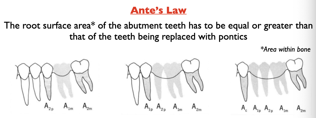 Ante’s Law: the root surface area of the abutment teeth has to be equal or greater than that of the teeth being replaced with pontics