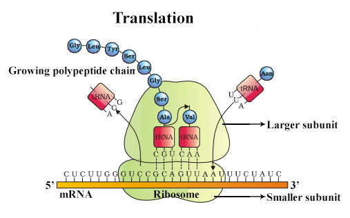 Termination: Translation continues until a stop codon is reached. Since there is no corresponding tRNA, a protein release factor binds instead. The polypeptide is released and the ribosome dissociates.