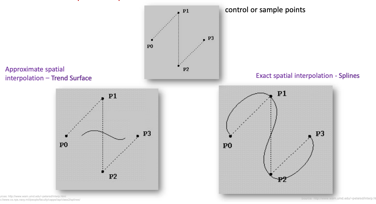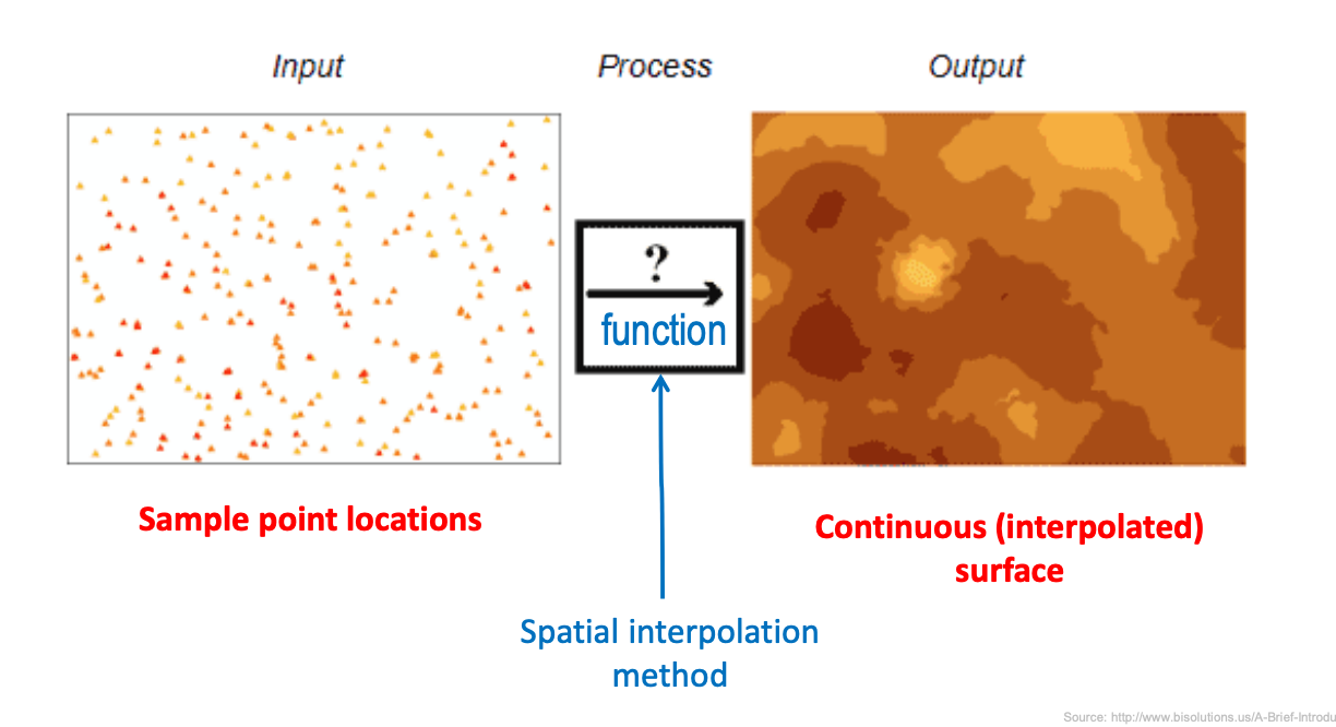 spatial interpolation: mathematical process of finding a function that will estimate/predict unknown attrubute values at any point from a given set of sample point locations