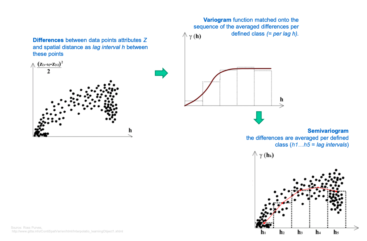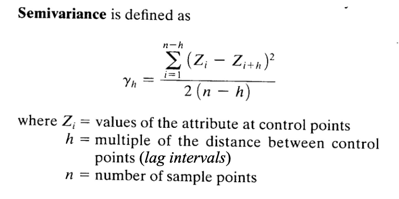 differences: each dot shows the squared difference in value b/w two data points, plotted against teh distancce (lag) h between them
