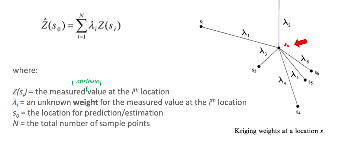given a sest of spatial data in the form of points (or areas), spatial interpolation is the process of finding the function that will estimate or predict values for any other points (or areas) and will best represent the whole surface