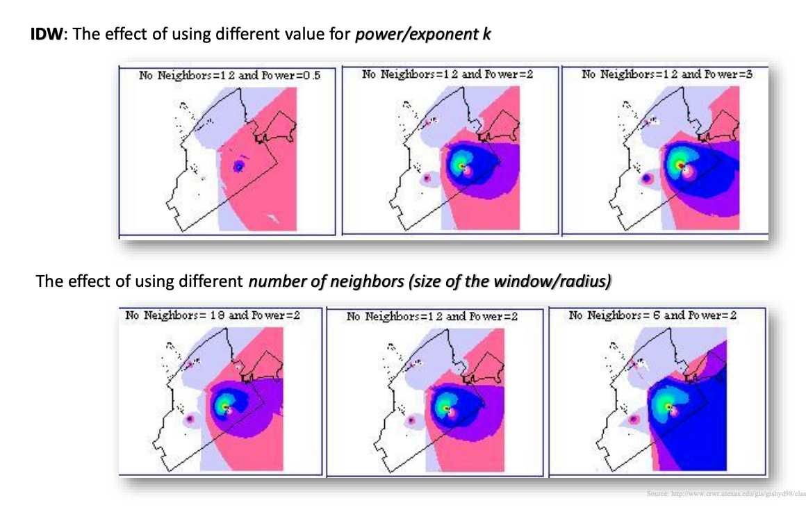 spatial interpolation methods should not be applied if the attributes of sample points represent the presence of an event (crime/disease), people, or some physical phenomenon (volcanoes, buildings), as the created continuous surface will be meaningless