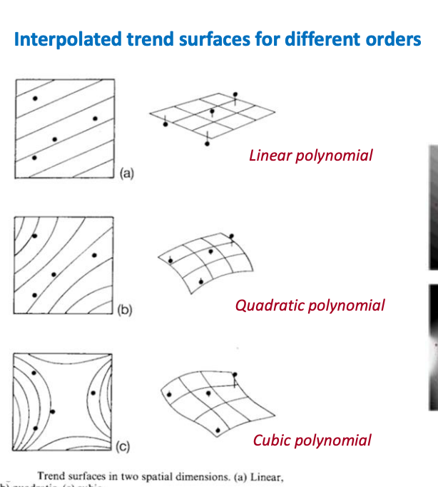 trend surface: fit a general mathematical function (polynomial or regression plane)