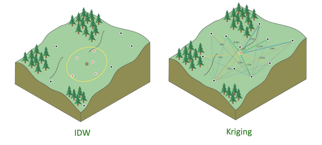 spatial interpolation proceeds by finding the function that will permit fitting a surface model to the measure sample data points, and then the values at any desired locations can be estimated/predicted using the spatial interpolation method