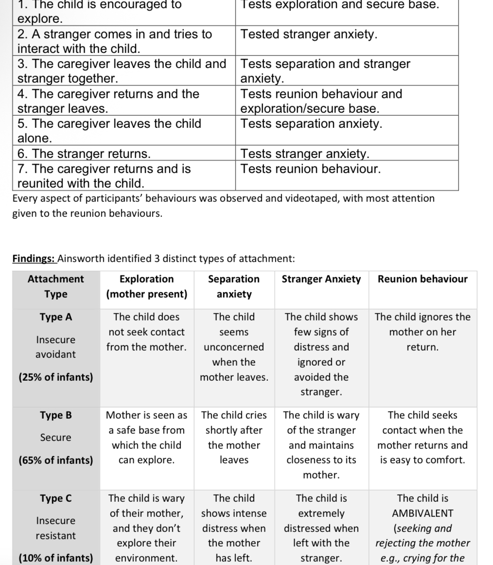 Mary Ainsworth developed the Strange situation, which was a study that took place in an unfamiliar observed room with infants of 100 middle class families ages 12-18 months. The procedure has seven episodes, each lasting three minutes. The first one where the child is encouraged to explore, the second when a stranger comes in and tries to interact with the child, the third where the caregiver leaves, the fourth where the caregiver returns and the stranger leaves, the fifth when the caregiver leaves the child alone, the sixth when the stranger returns and the seventh when the caregiver returns and is reunited with the child. These tested proximity seeking, exploration, separation anxiety, stranger anxiety and reunion response.