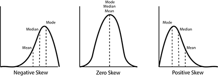 - Positive skew- scores are mainly below the mean, more scores on the left