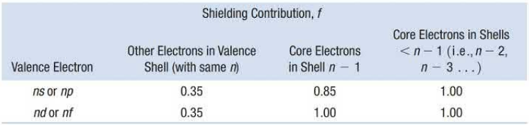 All electrons in the same principle energy level as the electron you are solving for are multiplied by 0.35. Any electrons higher, if they exist, are not counted. Electrons in one energy level lower than the one being calculated are multiplied by 0.85 is the electron we are solving for is in the s or p orbital, and 1.00 if the electron we are solving for is in the d or f orbital. Any electrons of a lower energy level than what has been calculated are multiplied by 1.00.