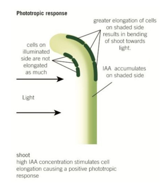 IAA is on the shaded side cause the cells to elongated in the presence of it so the cell walls stretch bending the shoot towards the light