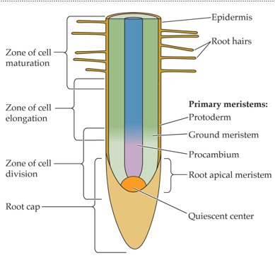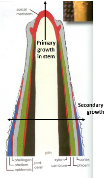 APICAL (tip ends)—Apical meristems contribute to primary growth—growth in length or height or initiation of new organs or branches.