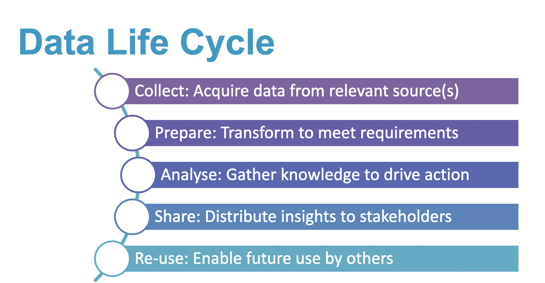 A critical discussion surrounds the data life cycle consisting of: collecting, preparing, analyzing, sharing, and reusing data.