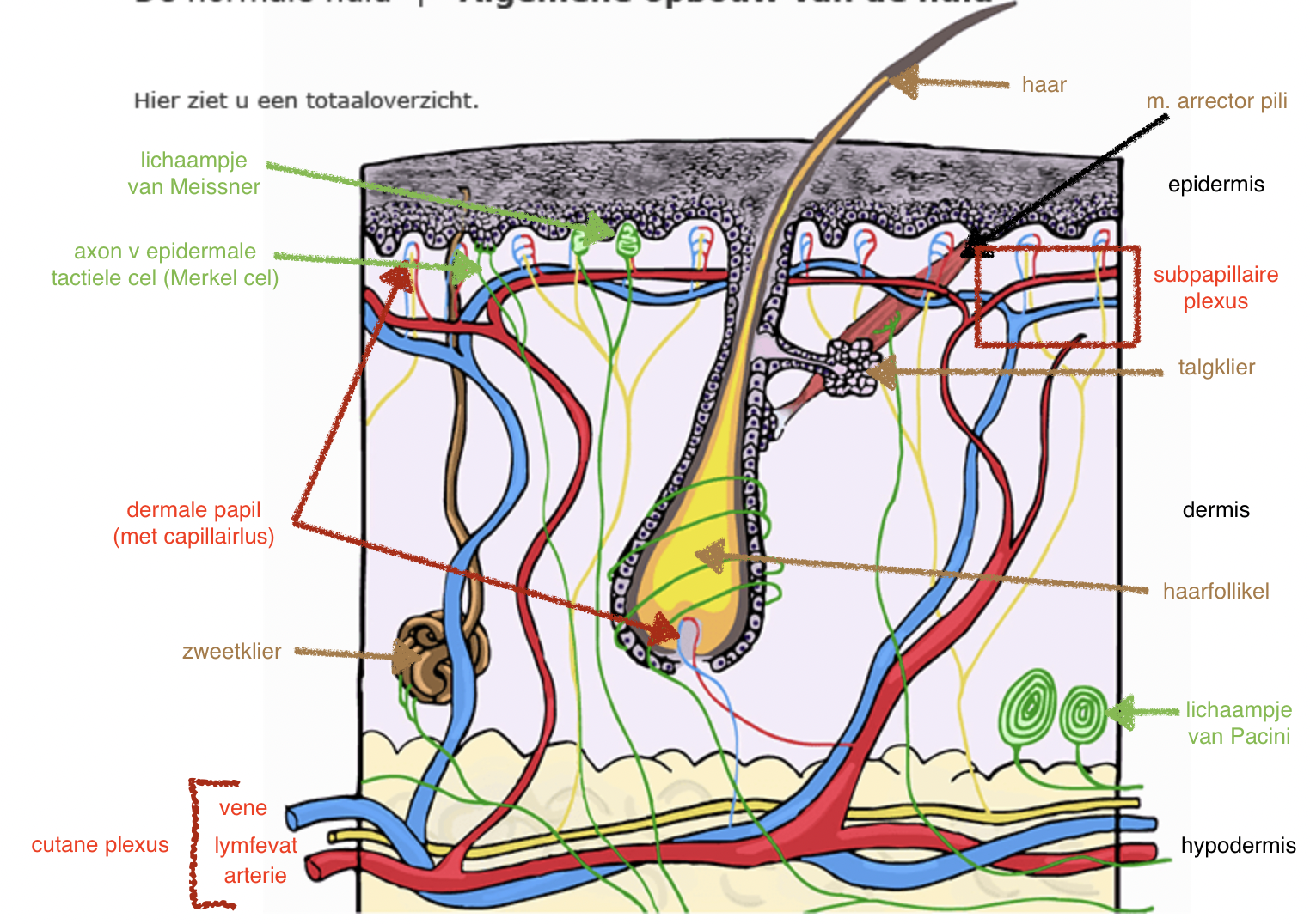 dermis bestaat uit bindweefsel + daarin adnexa, bloedvaten, zenuwen