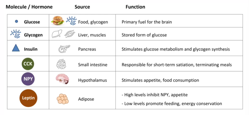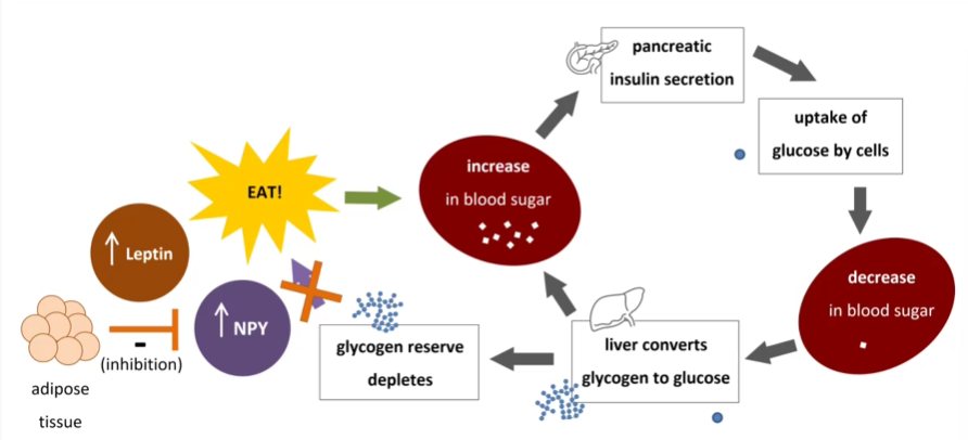 when glycogen reserves get low and NPY levels incerase to signal a need for food, leptin can be secreted from the fatty tissue to inhibit that drive to indicate that the need for food is not urgent. glycogen dec = NPY inc = leptin says hunger not urgent. eventually the drive to eat will win out