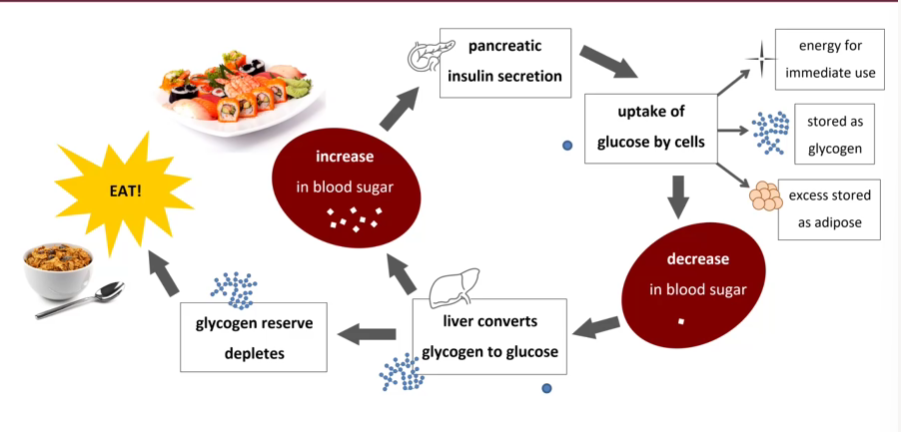 glycogen :: how the body stores glucose. some stored in muscles, but main supply in liver. can easily be converted to glucose when needed. insulin regulates glucose levels