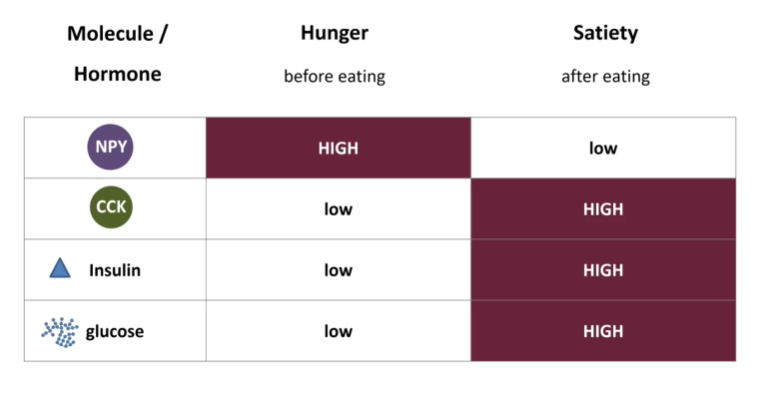 NPY :: neuropeptide Y. found in hypothalamus. causes hunger cue