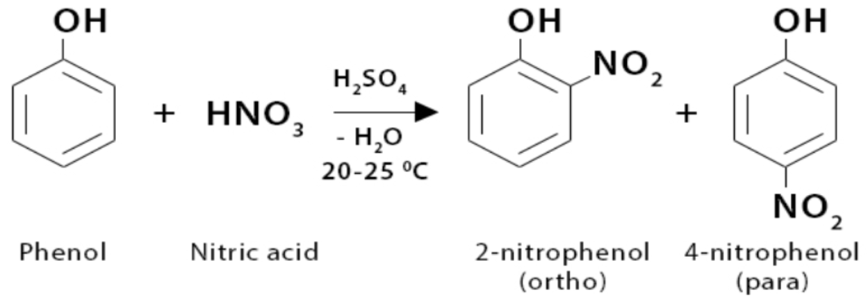Gives a mixture of ortho (1,2) and para (1,4) nitrophenols