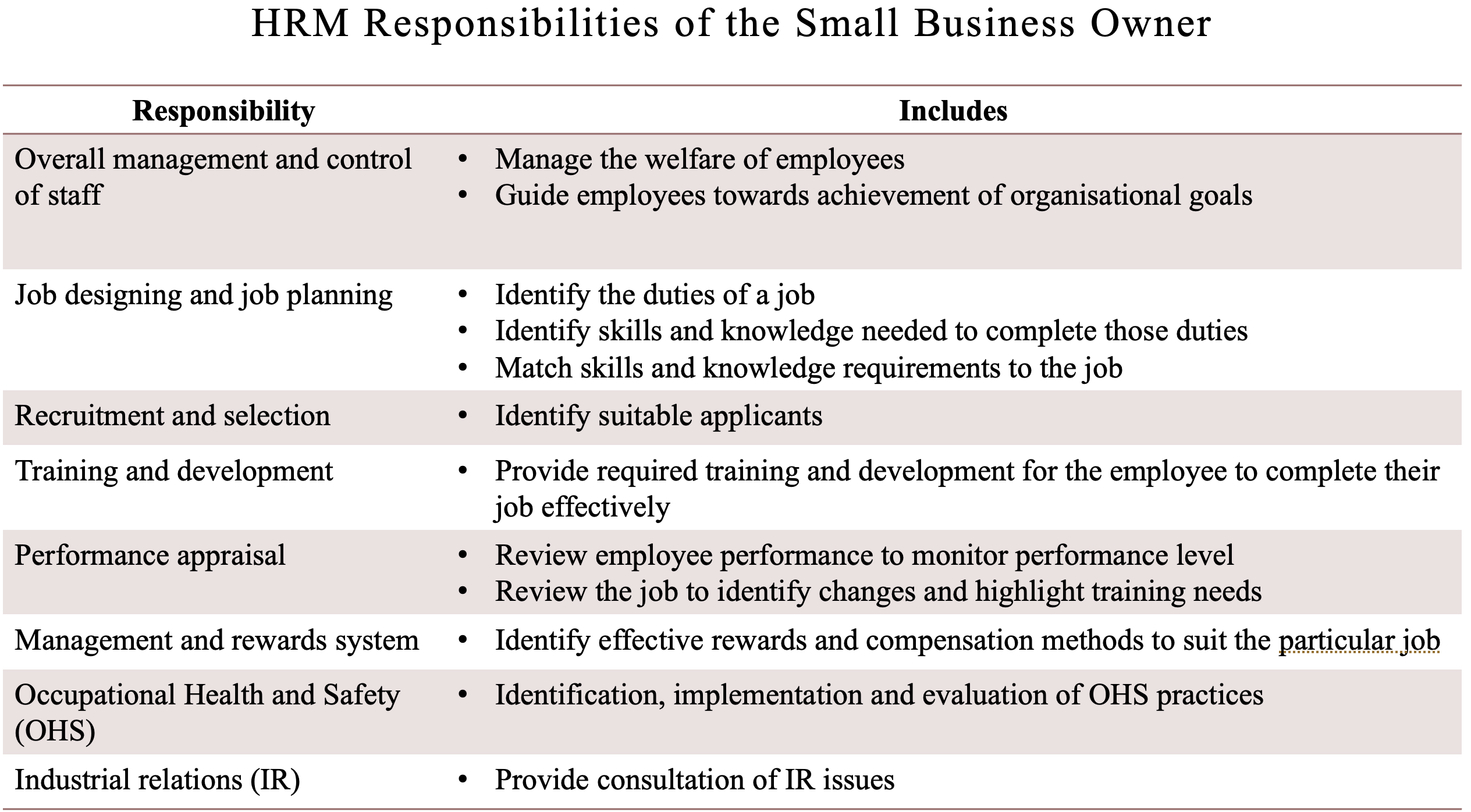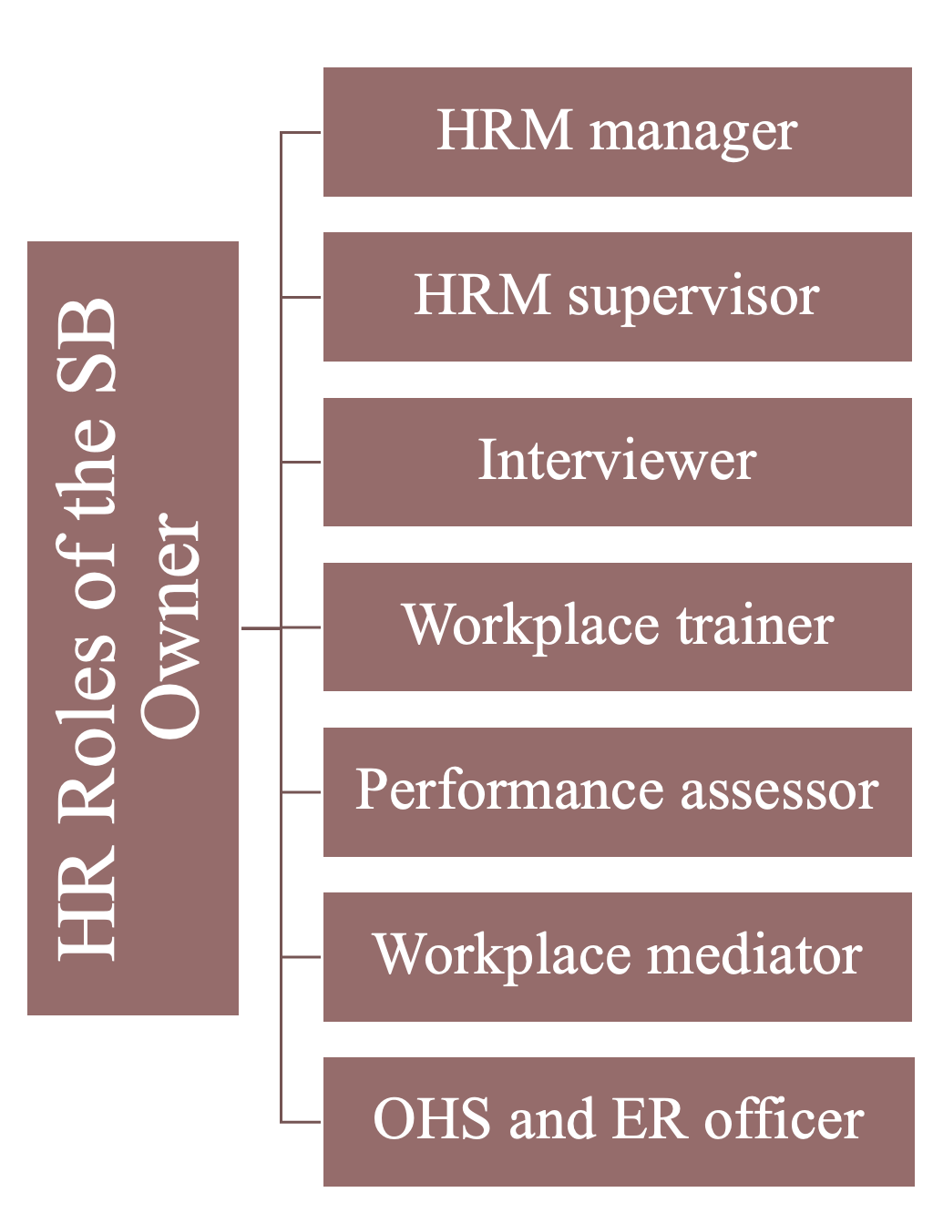 In a small business environment where there is no capacity to host large departmentalised operations, the role of a HR department is absorbed by the business owner themselves