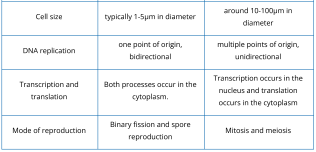 - Prokaryotic and eukaryotic cells vary in terms of presence of nucleus, endomembrane system, cell wall and cell membrane, ribosome, shape of DNA andnumber of chromosome, cell size, DNA replication, transcription and translation, and mode of reproduction.