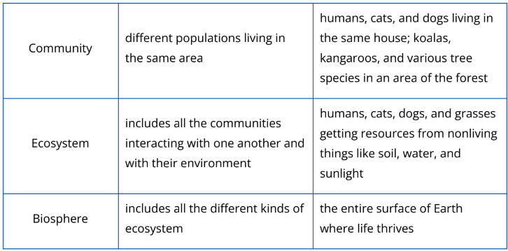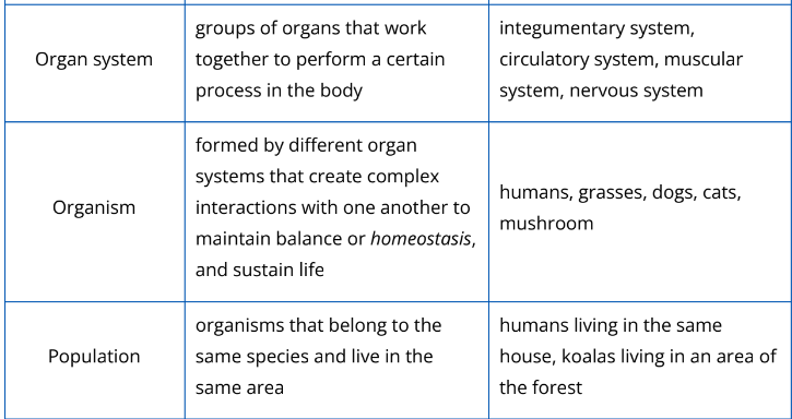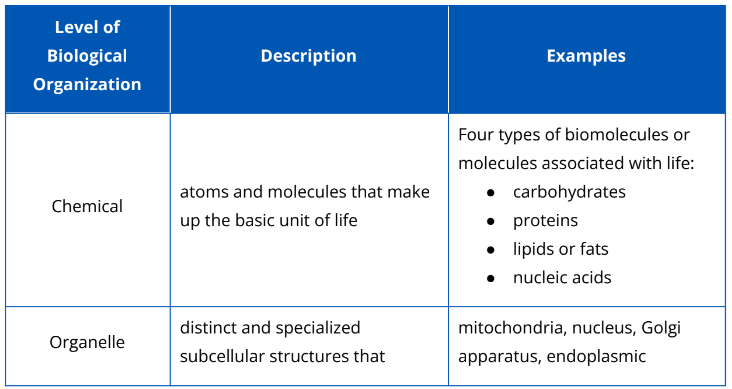 Biology is a vast field of study. To understand life from the molecular level up to the global scale of the entire living planet, biologists divide the enormous range into different levels of biological organization. The hierarchy of biological organization is shown in Fig. 2.2.1. The description and examples of each biological organization is shown in Table 2.2.1.