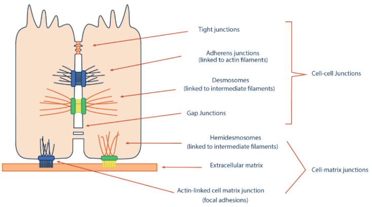 Fig 2.4.7. Cell junctions are found in epithelial cells and are mainly responsible for connecting adjacent cells. In addition, they may also facilitate the transport of certain substances between the adjacent cells of epithelial tissue.