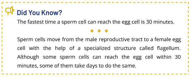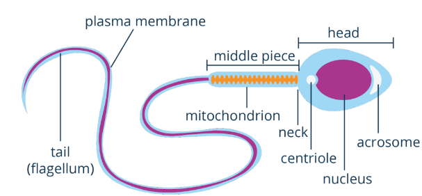 Sperm cells, by contrast, are relatively small compared with the egg cells. Sperm cells are specialized cells that have a flagellum. The flagella in sperm cells help them move from the reproductive tract of males to that of females. The sperm cells have three distinct parts— head, midpiece, and flagellum (as shown in Fig. 2.4.11). The sperm’s head contains acrosome that helps them penetrate the egg cell’s outer membrane, while the midpiece contains numerous mitochondria that provide energy to the flagellum. The tail-like region in the figure is the flagellum itself which provides motility to the sperm cell.