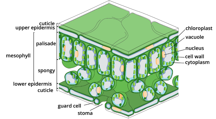 Fig. 2.4.14. Leaves have a mesophyll layer composed of palisade and spongy cells. The mesophyll layer is the primary site of photosynthesis in the leaves of a plant.