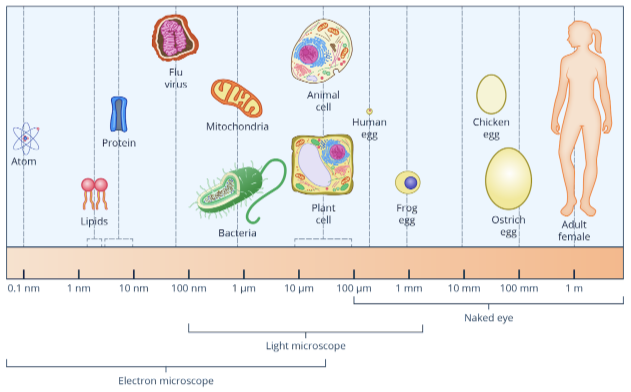 Relative sizes of bacteria (prokaryote), plant cell (eukaryote), and animal cell (eukaryote)
