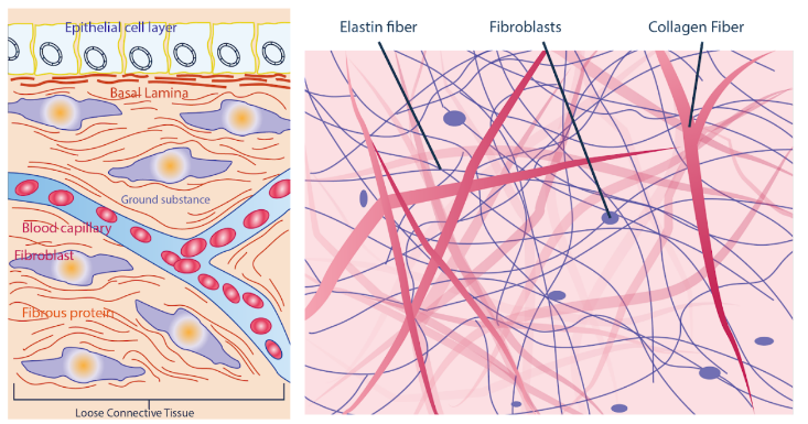 Fig. 2.2.4. The basic components of connective tissues vary according to their type (left, extracellular matrix; right, fibers and fibroblast).