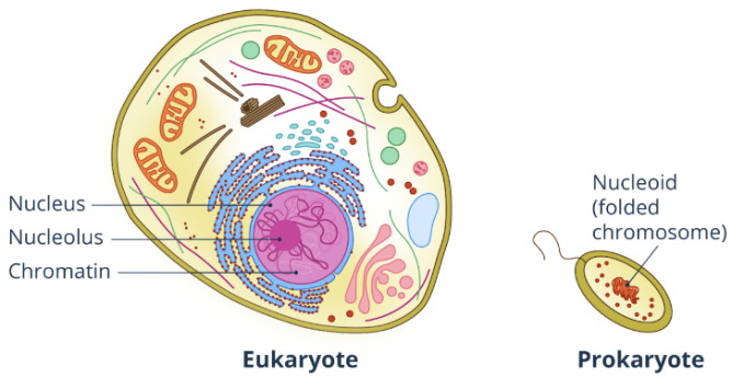 The main feature that distinguishes eukaryotic cells from the prokaryotic cells is the presence of a nucleus with a nuclear membrane that encloses the genetic materials (DNA or deoxyribonucleic acid) as seen in Fig. 2.1.2.. In a prokaryotic cell, the genetic materials (DNA) are concentrated in a region of the cytoplasm called the nucleoid. The term prokaryotic comes from the Greek terms pro- which means before and karyon or kernel that refers to the nucleus. On the other hand, the term eukaryotic comes from the Greek terms eu- meaning true and karyon or kernel.
