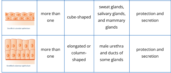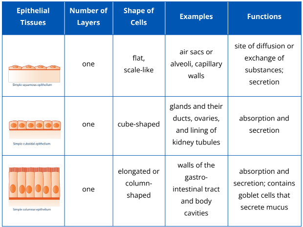 Epithelial tissues are classified based on cell arrangement or number of layers (i.e., simple and stratified epithelial tissues), and based on cell shapes (squamous, cuboidal, and columnar). They are given two names based on these two bases for classification. Table 2.2.2 below describes in detail the types of epithelial tissues in animals.