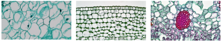 Fig. 2.3.6 Ground tissues parenchyma (left), collenchyma (center), and sclerenchyma (right) are generally responsible for storage, support, and photosynthesis. In these microscopic pictures, it is noticeable that they differ in structure in terms of primary and secondary walls.