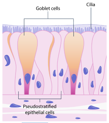 Cilia are found on the respiratory tract (as shown in Fig. 2.4.3). These hair-like structures above the pseudostratified epithelia of the trachea prevent mucus (from goblet cells), bacteria, and dirt from entering the lungs. These particles and pathogens are either coughed out or moved to the mouth to be swallowed into the gastrointestinal tract. Cilia are mainly responsible for motility. In the respiratory tract, cilia brush off cells and substances like bacteria, mucus, and dirt that may infect and harm our lungs. Moreover, the cilia in fallopian tubes move the egg cell to the uterus. Cilia can also be found in some unicellular organisms like the Paramecium.