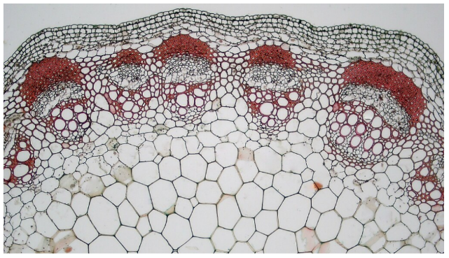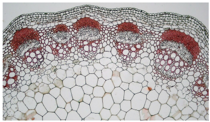 Fig. 2.4.15. Xylem and phloem tissues consist of specialized cells that are responsible for transporting essential substances, such as water, minerals, and food needed by the plants. The figure shows a bundle of cells (beneath the group of cells stained with red dye) called the vascular bundle. This consists of the cells of the xylem and phloem tissues.