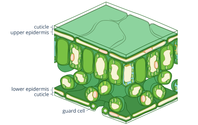 The lower and upper parts of leaves are protected by the epidermis (as shown in Fig. 2.3.5). The lower epidermis of a leaf has guard cells. Guard cells are specialized structures that regulate the opening and closing of stomata. Stomata are slit-like structures on the lower epidermis of leaves which aids in the exchange of gases between plants and the environment.