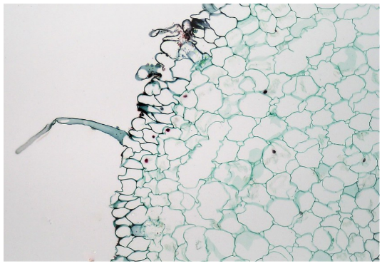 Epidermis, an outer protective layer in humans and in animals, is also found in plants. This outer protective layer originates from protoderm which is produced by apical meristems in roots and shoots. Epidermis covers the whole body of nonwoody and young woody plants and is protected by a waxy cuticle. The cuticle prevents loss of water and invasion of disease-causing microorganisms. The epidermis in roots has tiny projections called root hairs (shown in Fig. 2.3.4) which help in increasing the absorption capacity of roots. In leaves and in stems, the epidermis has tiny outgrowths called trichomes. These hair-like outgrowths prevent water loss and reflect excess light. When young woody plants mature, the epidermis is replaced by periderm which is produced by cork cambium.