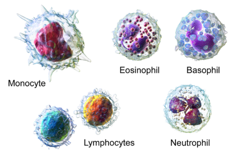 White blood cells, also known as leukocytes, are specialized cells that are classified into granulocytes and agranulocytes. Granulocytes are white blood cells that contain granules in their cytoplasms which are observable under a light microscope. These cytoplasmic granules are enzymes that digest pathogens that can cause diseases in the body. Neutrophils, basophils, and eosinophils are types of granulocytes. The nuclei in granulocytes are multilobed unlike that of a typical cell’s nucleus (as shown in Fig. 2.4.9). By contrast, agranulocytes do not have distinct granules in their cytoplasm. Also, their nuclei are not lobed as compared to granulocytes. Lymphocytes and monocytes are types of agranulocytes. Generally, white blood cells act as defenders of our bodies by identifying and targeting disease-causing microorganisms and parasites and even developing cancer cells.