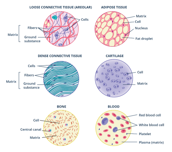 Connective tissue is the most abundant tissue in the body that connects body parts. Unlike the avascularized epithelial tissues, most connective tissues are vascularized (with constant blood supply from blood vessels) except tendons and ligaments. If epithelial tissues have a basement membrane, connective tissues have an extracellular matrix as shown in Fig. 2.2.4. These are varying amounts of substances found outside the cells. It is made up of ground substance and fibers. The ground substance is mostly made up of water, adhesion proteins, and large polysaccharides or complex sugars. The amount of polysaccharide determines the consistency of the matrix. Also, the amount and type of fiber vary depending on the type of connective tissue.