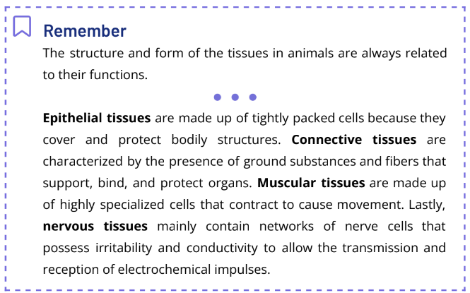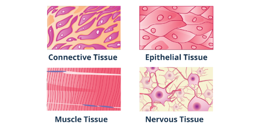 Tissues are groups of cells that are similar in structure and function. In animals, as shown in Fig. 2.2.2, there are four main types of tissue—epithelial, connective, muscle, and nervous tissues.