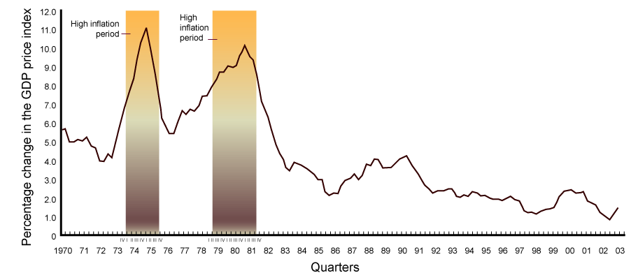 Percentage Change in the GDP Deflator (Four-Quarter Average), 1970 I-2003 II