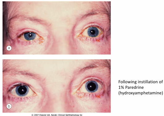 1% hydroxyamphetamine (Paredrine) - stimulates release norepinephrine into synapses from post-ganglionic nerve endings.