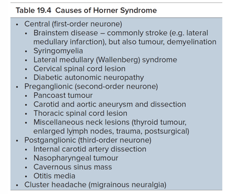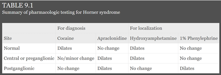 Pharmacological testing can also assist in localizing Horner’s syndrome as being central (first-order) or pre-ganglionic (second-order) or post-ganglionic (third-order).