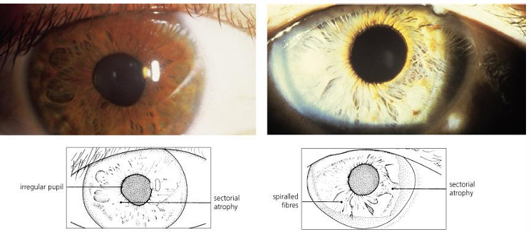 Sector palsy of the sphincter, sector atrophy, spiraled iris fibers.