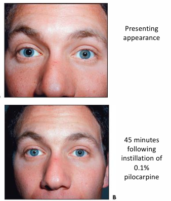 Pharmacological testing: An Adie's pupil will constrict in response to 0.1% pilocarpine (a direct-acting parasympathomimetic drug). This concentration should not constrict a normal pupil.