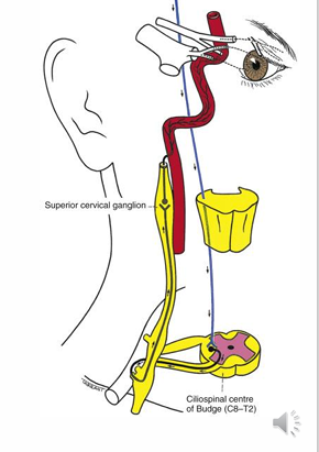 Third-order neuron: SCG along the internal carotid to join the ophthalmic division of the trigeminal nerve via the nasociliary and long ciliary nerves to the CB and dilator of the iris.
